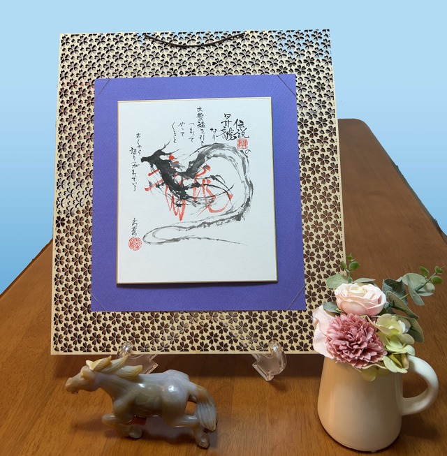 力強く、潔く。運を呼び込む「左馬」の一筆。 「左馬(ひだりうま)」は、古くから商売繁盛・盛運招来・福徳円満を招く縁起の文字として親しまれています。 「馬」を左右反転させた形が「うま(馬)」→「まう(舞う)」に通じ、 **“福が舞い込む”**とされる吉祥の象徴です。 本作は、伝統的な題材を現代的な感性で表現したモダン書アート。 一筆ごとに宿る墨の勢いと余白の美が、 空間に力強くも静かな存在感を放ちます。 額装せず、色紙そのままの質感を活かした仕上げです。 和の空間はもちろん、モダンインテリアにも調和し、 玄関や書斎、店舗などに飾ると凛とした気を感じられます。 作品詳細 作品名:左馬(ひだりうま) 技法:墨書(手描き原画) 紙:色紙 サイズ:約 縦22cm × 横9cm 額装:なし(色紙そのままの状態でお届け) サイン:あり 一点物の原画 【発送方法】 防水対策をしたうえで、厚紙で補強してお届けいたします。 ※実物とモニターの色味が若干異なる場合があります。 おすすめの飾り方 玄関やレジ横に飾ると、商売繁盛の縁起飾りとして◎ 書棚やデスク脇に立て掛ければ、気を引き締めるアートピースとして。 開業祝いや新築祝いなど、贈り物にも最適です。 力強さと静けさを併せ持つ一筆が、あなたの空間に新しい気をもたらします。 世界に一つの「左馬」をお手元にどうぞ。